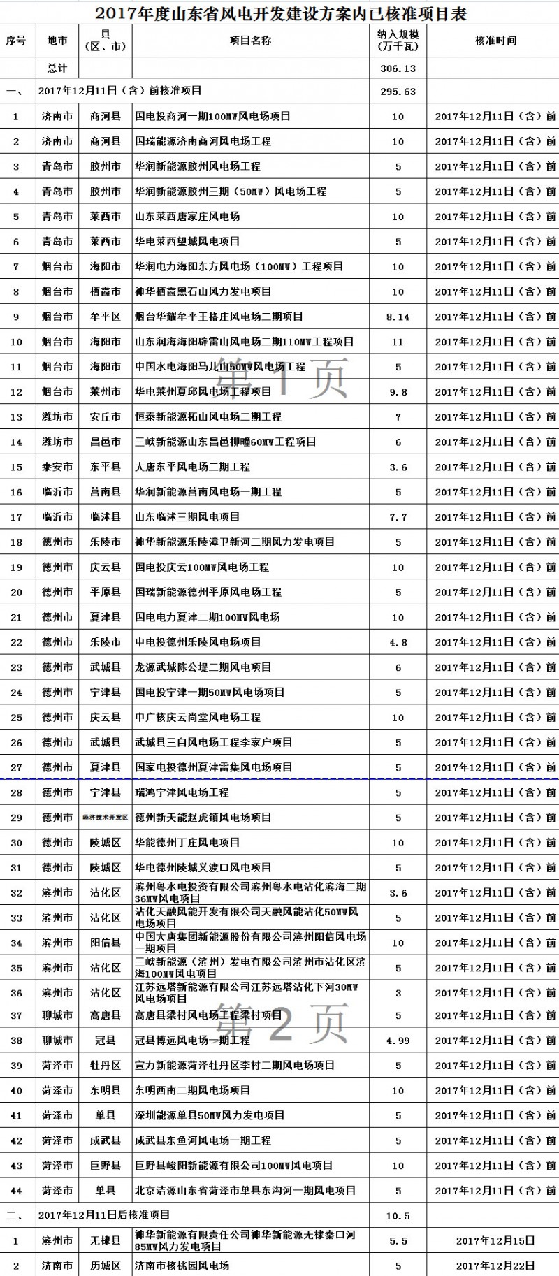 根据我委《关于做好2017年度山东省风电开发建设方案项目核准工作的通知》要求,截至2017年12月25日,我省2017年度风电开发建设方案内项目共核准306.13万千瓦,现予以公示。