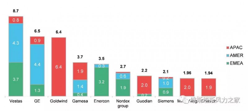 在彭博新能源财经与丹麦MAKE咨询公司所发布的2016年全球风电整机制造商新增装机量排名*中,维斯塔斯均以8.7GW的新增装机量名列陆上风电新增装机量第一。
