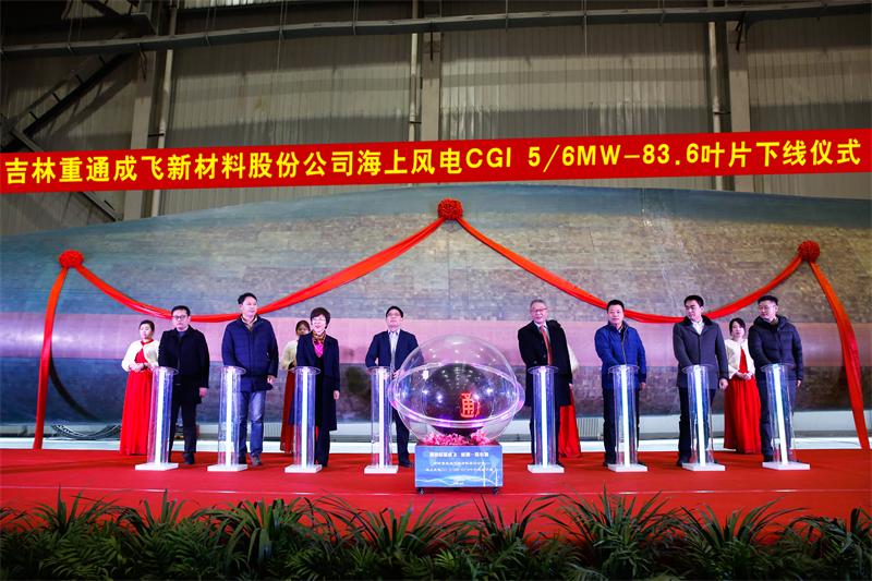 2018年2月6日,吉林重通成飞新材料股份公司(以下简称:重通成飞)海上风电CGI5/6MW—83.6叶片下线仪式在江苏省如东县顺利举行,此次活动邀请了如东县政府领导、整机企业以及行业知名专家学者等几十位嘉宾莅临现场,共同见证了国内最长海上风电叶片的成功下线,同时也标志着我国风电行业的发展又迈出了坚实的一步。