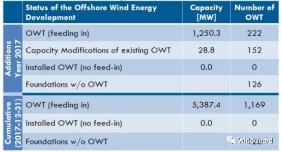 2017年,201台海上风机建成,发电容量1128MW。所有这些风机在当年并入电网。此外,截至2016年底,还没有开始并网的风机在2017年年底之前也完成并网。因此,到2017年底,所有安装在德国的海上风机都将投入电网。