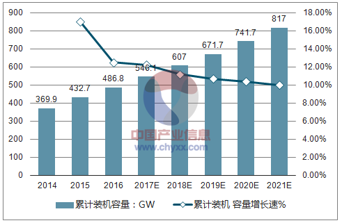 2016 年全球风电累计装机容量达到486.8GW,增长12.5%,新增装机容量超过 54GW。全球风能理亊会认为到2021 年全球风电累计装机量有望达到800GW,年均复合增长率为10.5%,新增装机量将超过75GW,年均复合增长率约为6.8%,全球风电行业整体平稳增长。