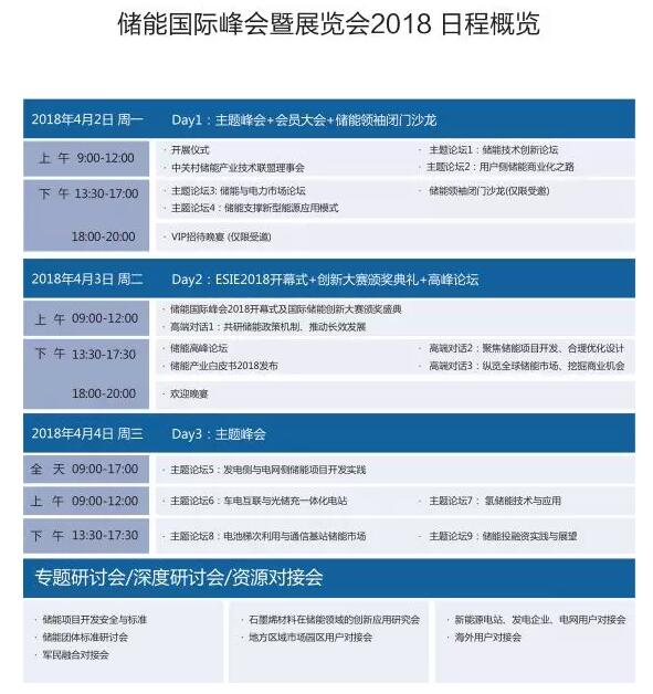 “储能国际峰会暨展览会2018(ESIE 2018)”,将于2018年4月2-4日在北京国家会议中心举行。ESIE 2018是在国家能源局科技装备司指导下,在中关村管委会、中国能源研究会支持下,由中关村储能产业技术联盟(CNESA)打造的储能产业专业品牌会展被誉为全球范围内市场定位最精准、最具影响力的储能专业品牌展览会,亦是储能业内含金量最高、指导性最强的高规格会议。ESIE 开创了“会、展、赛”三位一体的创新格局,通过主题演讲、高端对话、展览展示、主题研修、专题研讨、项目考察、新品发布、技术交流、媒体推广等多种形式,多维度精准对接全球储能市场与应用,助力中国储能企业与国际接轨,同时致力于推动中国储能产业机制的建立,为储能企业提供与政策制定者、规划者、电网管理者、世界大型电力公司面对面交流的机会,是专业观众、参会代表和展商沟通交流,实现储能技术商业化的重要平台。
