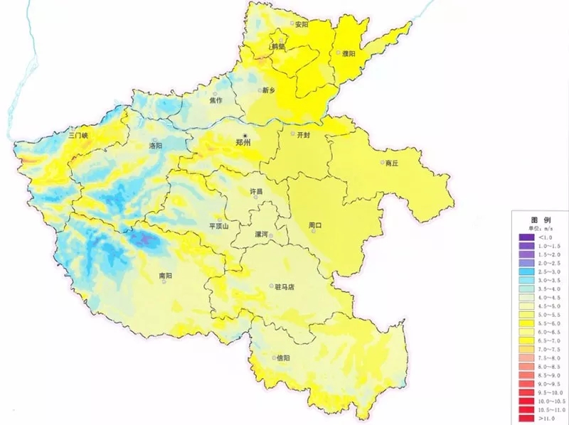 河南省风能资源丰富区主要分布在:豫北太行山东部(安阳、鹤壁和新乡)的山地和山前丘陵高地;豫西三门峡、洛阳境内的崤山山脉和黄河南岸的山体;郑州、平顶山、南阳、驻马店一带山区与平原过渡地带的山体和丘陵高地;大别山区和桐柏山的局部山区;豫西伏牛山、熊耳山和外方山的局部山地;太行山南部(济源、焦作)局部山体。其中,河南省中部山区向平原过渡区的低山丘陵(海拔为200——700m),是风能资源开发价值最好的区域。在我国中部地区属风电开发潜力较大的省份之一。风能资源年变化规律一般是冬天、春季节较好,夏、秋较差,3-4月为最高值,8-9月为最低值。