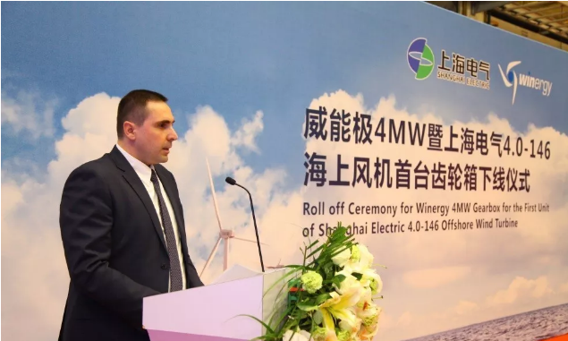 威能极中国总经理周龙(Zoran Aleksic)代表威能极对上海电气风电集团领导的莅临表示欢迎和感谢。周龙先生在致辞中表示,如何满足日益变化的市场需求,高效、快速的完成新产品的开发和生产,对于上海电气和威能极双方来说都非常重要。感谢上海电气对威能极的信任和支持,感谢威能极国内外团队的巨大努力,使我们得以在此刻见证4MW升级版齿轮箱的顺利下线。未来,威能极将与上海电气一起,持续致力于中国海上风电市场的发展和创新。
