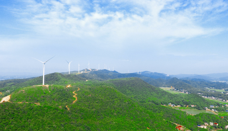 在湖南长邵娄高速公路旁,花明楼镇北部的神仙岭连绵起伏的山脉上,一台台风力发电机擎天而立,迎风飞旋。风机与群山相衬,成为当地一道独特而壮观的风景,这正是由三一投资建设的宁乡观音阁风电场。