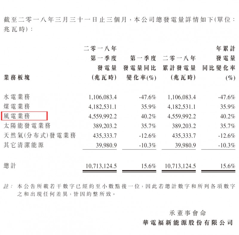 东方风力发电网获悉:2018年第一季度华电福新能源股份有限公司完成总发电量10,713,124.5兆瓦时,较二零一七年同比增加15.6%。其中,风电发电量为4,559,992.2兆瓦时,较二零一七年同比增加40.2%。以下为具体统计数据: