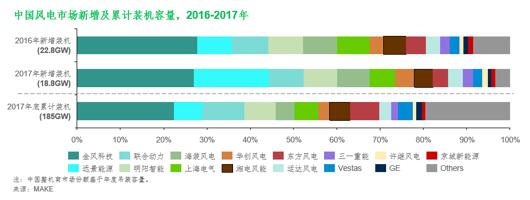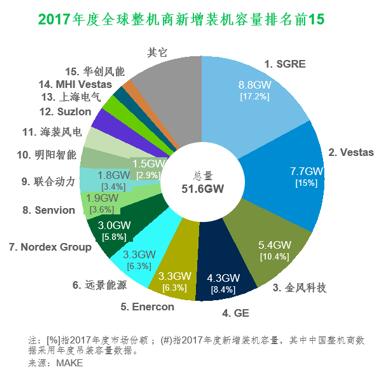 中国企业当中,远景能源在2017年度中国风电发展整体放缓的情况下,装机容量仍拓展至20个省区,在国内中东部及南方地区未获得红色预警的省份稳固了其市场地位,排名上升至全球第六。全球排名前15中还有联合动力、明阳智能、海装风电、上海电气和华创风能。其中,华创风能凭借与前东家大唐集团的合作首次跻身全球排名前15。