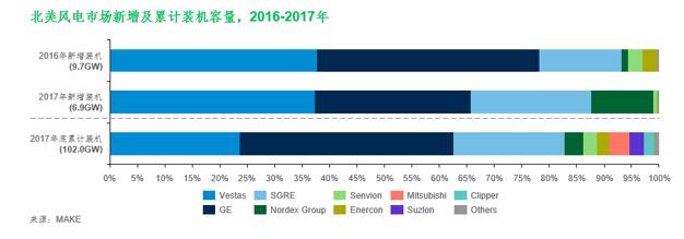 l 3MW+机型的市场需求增加,成为2017年度北美市场并网容量的分水岭。Vestas的 3MW机型(V117和V126)和Nordex(AW3000)机型双双走俏,两者的新增装机量占区域内3MW+机型并网总量的91%;