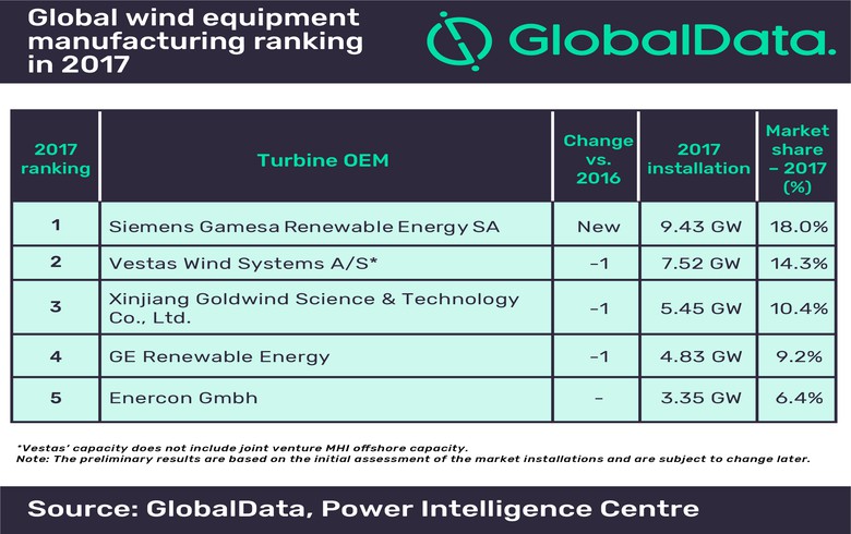 GlobalData补充说,2017年风电领域的前5名原始设备制造商(OEM)占总装机容量的58%,比前一年增长近7%。