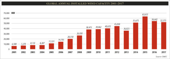 根据全球风能理事会(GWEC)发布的一份新报告,在2017年新增超过52吉瓦的新风电容量后,未来五年全球风电行业将继续强劲增长。