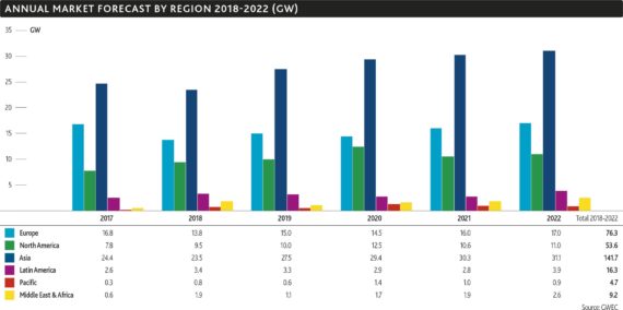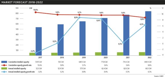 在接下来的五年中,中国仍将是全球的主导市场,但预计不会有与过去几年相同的惊人增长水平。美国市场将持续强劲增长到2022年甚至以后。而巴西将仍然是拉美领先的市场,尽管阿根廷将很快开始参与竞争。GWEC还预计新的市场将继续出现在非洲和亚洲。