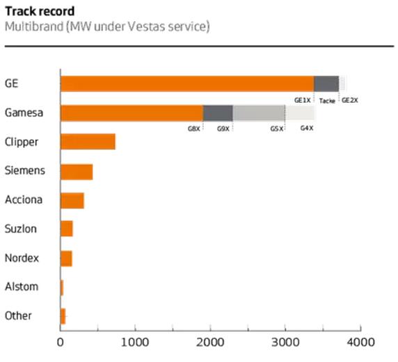 维斯塔斯运维的其他品牌机组容量达到了8 GW(不包括此笔订单),覆盖了国际主流整机品牌与机型。