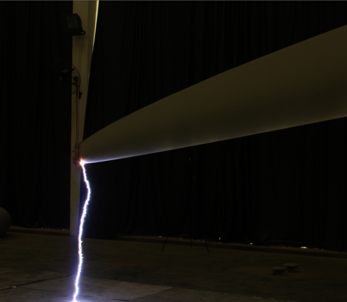 海装按照IEC规范,开展了叶片防护系统试验。1000KV高电压初始先导附着及扫略试验; 200KA,300C,10MJ大电流冲击及能量转移试验。经系统化验证,碳纤维主梁无需采用引下线设计,采用合适的铜网防护方案可保证防雷安全,且取消引下线设计还减少叶片内部产生电弧的风险。