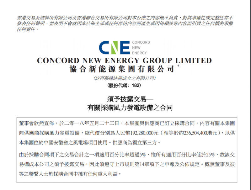 协合新能源公布,向独立第三方采购风力发电设备,包括主机组、发电系统、控制系统硬件及软件等,以供集团位于安徽省之风电场项目使用,总代价1.92亿人民币(约2.36亿港元),将以内部资源及/或借款拨付。