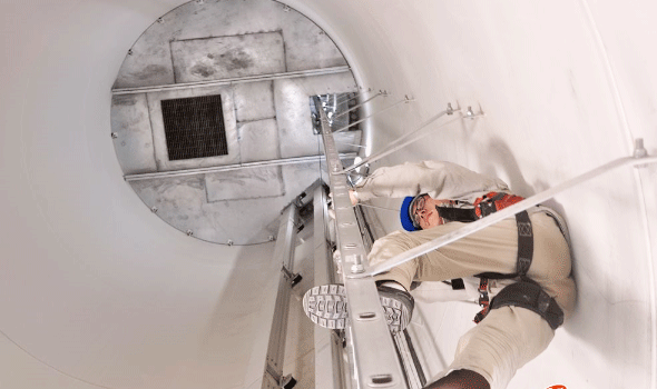 当安全措施落实完毕,检修员韩志翔开始攀爬风机,仅仅几分钟韩志翔就能爬到顶端机舱内。