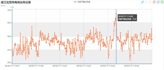 “玛利亚”正面登陆风场后,湘电风能机组自动进入抗台风模式,根据预设的控制策略始终让机组自身处于载荷最低的状态,以最“柔”的方式抗击台风。在台风过境期间,北茭风电场监测到的最大瞬时风速达到惊人的70.6m/s!尽管极风已经超出IECⅠ类安全等级,湘电风能的所有机组始终以勇士的姿态,直面狰狞咆哮的台风,笑看风云过。