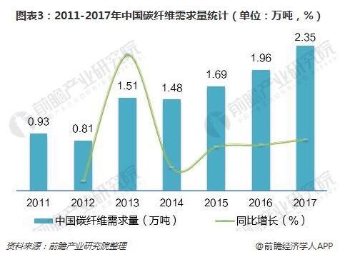 碳纤维性能优异,广泛应用于风电叶片、航空航天、体育用品、汽车工业、混配模成型、压力容器、建筑补强、电子电器等领域,被誉为"黑色黄金"。近年来,我国碳纤维的需求量呈现波动增长的态势。以体育用品及风电叶片的强劲增长带动了我国碳纤维的消费量。2017年,我国碳纤维需求量实现高速增长,达到2.35万吨。