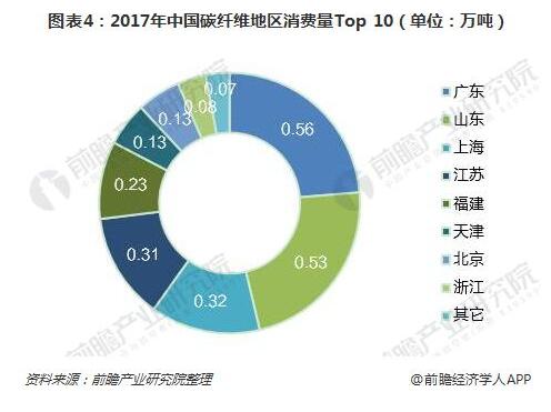 从中国碳纤维消费量来看,2017年广东依然保持第一,消费量达0.56万吨;山东省紧随其后,碳纤维消费量为0.53万吨,但山东省碳纤维消费主要是低成本风电纤维,所以消费金额还是没有进入广东与上海的亿美元俱乐部;上海和江苏的碳纤维消费量也分别达到了0.32万吨、0.31万吨;其它地区的碳纤维消费量均少于0.3万吨。