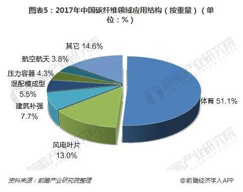 碳纤维的质量决定了其应用领域,我国在碳纤维生产与应用方面与国外先进水平还存在较大差距。相比于全球的碳纤维产业应用集中于风电叶片(23.5%)、航空航天(22.8%)和体育休闲(15.7%)领域,我国的碳纤维市场需求仍主要来源于相对低端的体育休闲领域,2017年其消费量占到碳纤维总需求量的51.1%左右;风电叶片领域2017年消费量占比为13.0%,较全球水平仍有明显差距;而航空航天领域消费量占比仅3.8%,严重偏低。我国碳纤维产业应用结构有待优化。