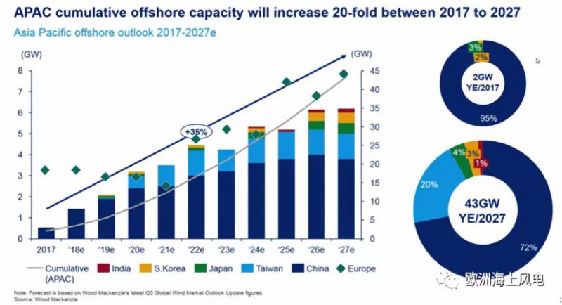 其实,他的结论来自MAKE的一份调查研究报告。据这份报告指出,到2027年,亚太地区的海上风电容量将会增长20倍,达到43GW,光中国每年平均就能接近4GW。
