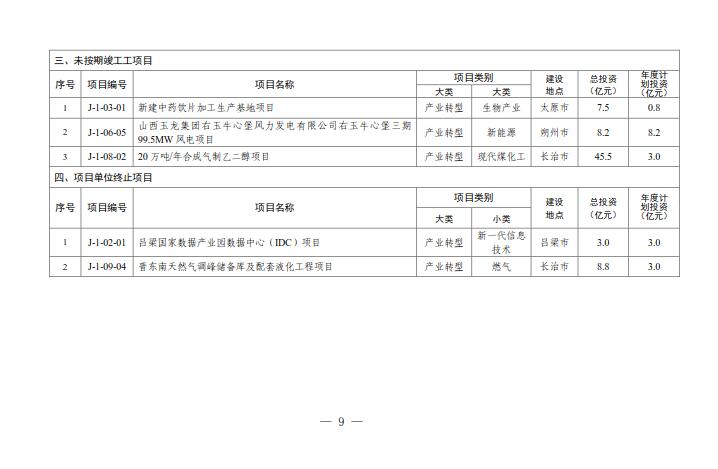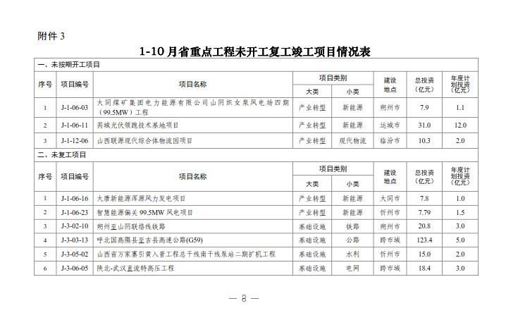 2、大唐新能源浑源风力发电项目,装机容量为100MW,年度计划投资1亿元。智慧能源偏关风电项目,装机容量为99.5MW,年度计划投资1.5亿元。两项项目均为未复工项目。