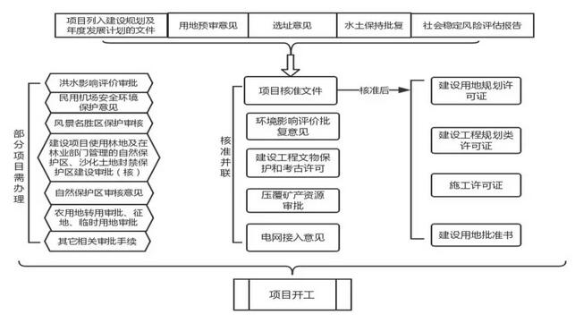 风电项目前期审批部门多,办理程序比较复杂。项目开发手续方面,在开工之前除取得核准文件以及核准前置的项目列入年度发展计划的文件、用地预审意见、规划选址意见、水土保持批复以及社会稳定风险评估报告外,还需取得环境影响评价批复意见、文物保护和考古许可、压覆矿审查意见以及电网接入意见等审批文件,以及依据根据每个项目的特殊情况,可能还需要取得洪水影响评价、民用机场安全环境保护意见、风景名胜区保护审核、用林(草原、沙化土地等)审批文件、自然保护区审核意见、农用地转用、征地、临时用地审批以及其他应当办理的审批文件。在项目工程建设手续方面,需办理建设用地规划许可证、建设工程规划类许可证、施工许可证和建设用地批准书等许可文件。详见下表:
