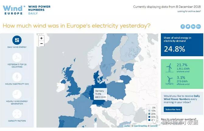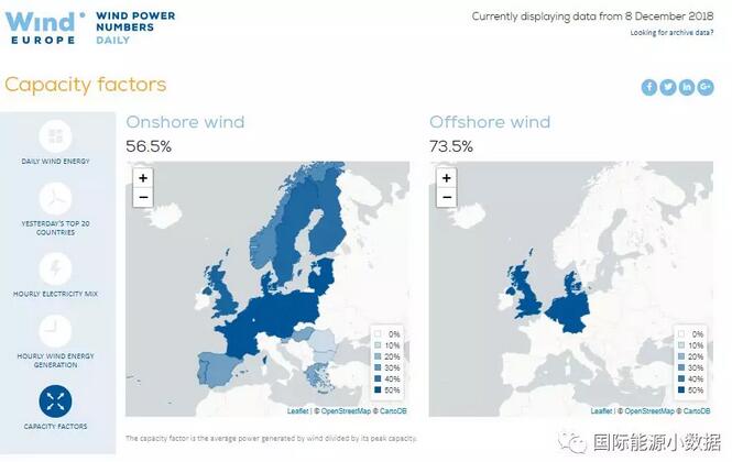 根据WindEurope.Org的监测数据,刚刚过去的周六(2018年12月8日),风力发电满足了欧洲24.8%的电力需求。其中陆上风电容量系数为56.5%,发电量19.11亿千瓦时(占需求21.7%),海上风电容量系数73.5%,发电量2.73亿千瓦时(占需求3.1%)。