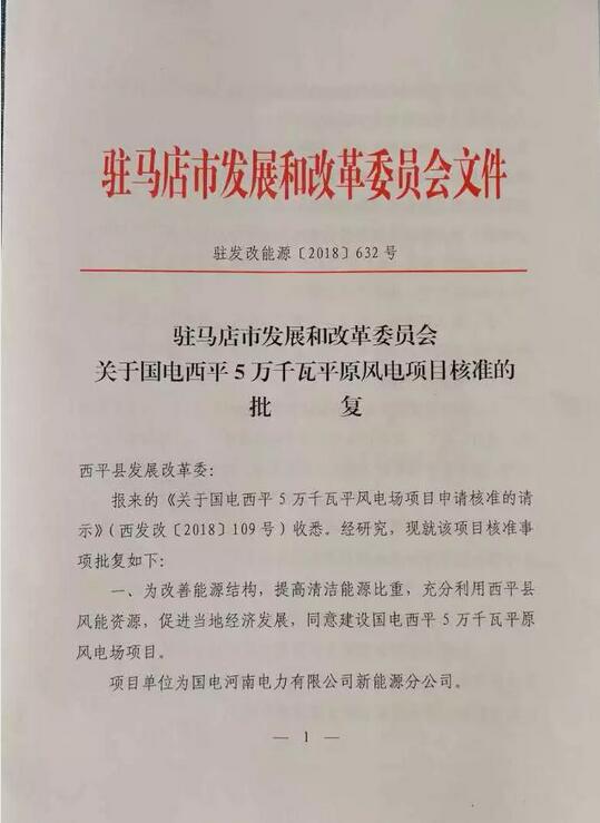 2018年12月14日,河南省驻马店市发展和改革委员会下发《关于国电西平5万千瓦平原风电项目核准的批复》(驻发改能源[2018]632号),标志着河南公司在豫南地区首个风电项目获得核准,取得了在豫南区域风电开发的实质性突破。