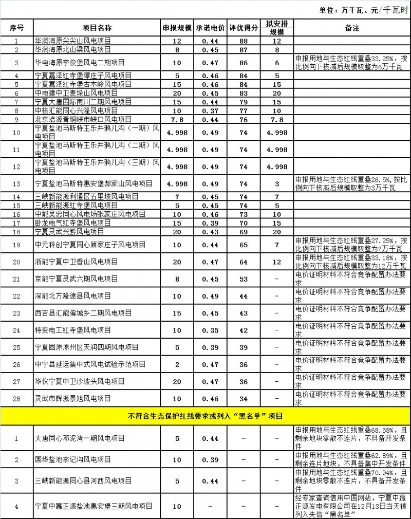 宁夏风电基地2018年度风电项目竞争配置评优结果公示表