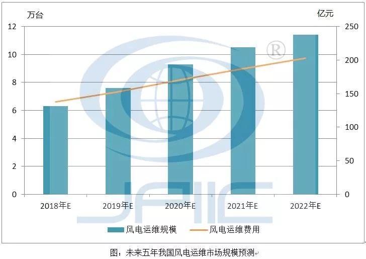 由于2010年以来我国风电每年新增装机规模超过1000万千瓦,经过多年累积后,风电运维服务市场正在加速形成,并且规模不断壮大,预计到2022年风电运维服务市场规模将达到1.8亿千瓦左右,年度运维服务费用总额将超过200亿元。