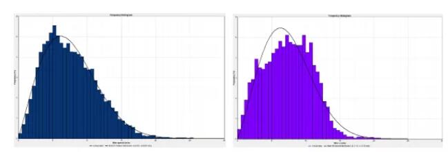 第一个项目位于甘肃玉门,在相距60公里的距离分别规划了300MW开发容量的两个场区,盛行风向都是正西和正东风。根据风电基地标准排布间距来进行布机,每个场区都使用单机容量2.0兆瓦的风机布置150台,进行发电量的测算。然而虽然场区A的机位平均风速比场区B高0.12m/s,但发电量却少了8%。为什么风速高的场区发电量不仅不多,反而差这么多呢?