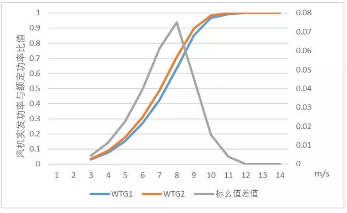 此外,在风机型号的选择上也导致场区A的发电量不及预期。如图是两个场区所使用风机的功率曲线标幺值以及对应的标幺值差值。我们可以看出,标幺值差值在7-9米每秒的风速区间达到峰值,说明在这个风速段中,两种风机的发电性能是有较大差异的。针对不同风资源特性的场区,需要对症下药,选择匹配度最高的风机,以获得最大收益,减少资源浪费。