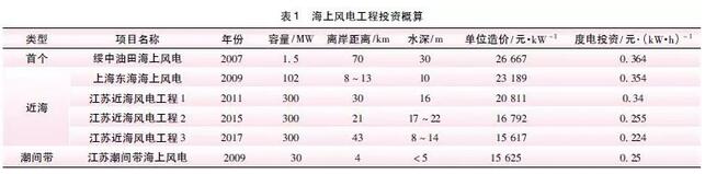 2007年,我国首个海上风电试验机组在绥中油田正式建成,采用1台金风科技1.5MW风电机组进行试验示范,标志着我国海上风电发展取得实质性突破。该项目受规模小、离岸距离远、前沿科技成本高等因素影响,单位造价达到26667元/kW,度电成本0.364元/(kW·h)。2010年6月8日,亚洲第一个商业化运行的海上风电项目———上海东海大桥风电项目的34台3MW海上风电机组调试完毕,全部并网投入运行,标志着我国风电拉开海上开发的序幕,该项目也属于早期海上风电项目,造价达到23189元/kW,相对较高。