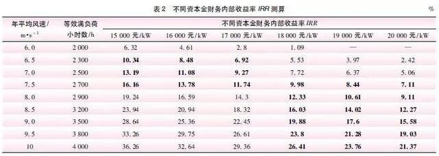 根据对我国海上风电场风能资源、造价水平的分析,按现行财税和电价政策,对不同建设条件下海上风电工程进行资本金财务内部收益率测算,结果见表2。若长江以北地区海上风电投资水平不超过17000元/kW、风能资源达到6.5m/s(发电小时大于2300h),资本金内部收益率IRR基本能够满足8%的要求,具有一定的投资开发价值;若长江以南地区海上风能资源超过7.5m/s(发电小时大于2700h),资本金收益率IRR基本可满足8%的要求,且具有较好的投资回报水平。