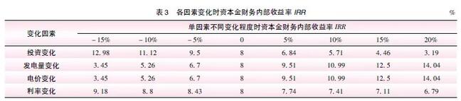 通过单因素敏感性分析,研究投资、电量、电价、利率等因素分别变化为-15%~20%时,对资本金收益率IRR的敏感性影响结果。某海上风电项目,静态投资17000元/kW,年平均满负荷利用小时数为2400h,上网标杆电价为0.85元/(kW·h)(含税),资本金内部收益率IRR为8%。各因素变化对资本金财务内部收益率IRR敏感性分析计算结果见表3。