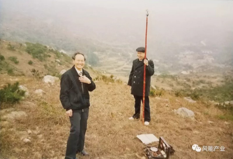 约在1994年,水规院开展风电规划和设计工作,朱瑞兆去讲“全国风资源情况及WASP的应用”。水规院设计南澳风电场时,在微观选址方面大家都没有经验。于是朱瑞兆建议去现场考察。朱瑞兆从气象局借了几十台手执风速仪,一众20多人,有水利部能源处处长,有水规院院总工,还有十多位年轻人,这是我国第一次大规模的风电场现场考察。按气象规范,手执风速仪必须安装在2米高的位置,所以做了几十个2米多高的杆子,将风速仪固定在杆子上,到现场按地形布置了十多个测点,每一点有一台测风仪,统一发信号,每半小时观测一次,工作约进行2天后,测出了各点的风速大小,作为最后确定机位的位置。上图是当时测风时的情景。
