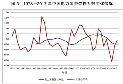 从1978年到2017年我国电力消费弹性系数(全社会用电量增速/GDP增速)来看,各年的弹性系数值在0—2之间,且年际间波动较大,体现不出电力消费是经济增长“晴雨表”的稳定关系;但10年滑动平均弹性系数曲线在0.8—1.2之间,且呈现出较规律性的波动,既反映出了“晴雨表”特性,也反映出弹性系数的周期性变化(见图3)。