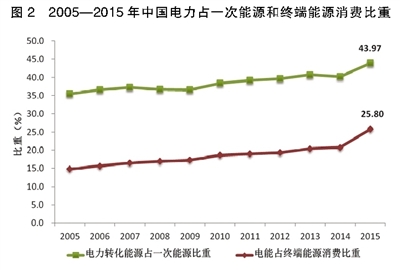 当前我国与发达国家电能在终端能源消费中的比重持平,且我国还略高于英国等发达国家。这种现象使一些专家认为,我国电能占终端能源比重不会再提高。笔者认为,发达国家天然气在终端能源消费中的比重约为25%,而我国在7%左右,我国计划在2020年力争达到10%,2030年达到15%左右。制约天然气发展的主要因素是资源、价格以及相对于可再生能源碳排放仍然较高的特性。要提高我国终端能源消费的清洁化,需要同步提高可再生能源发电比重及电能在终端能源消费中的比重(见图2)。