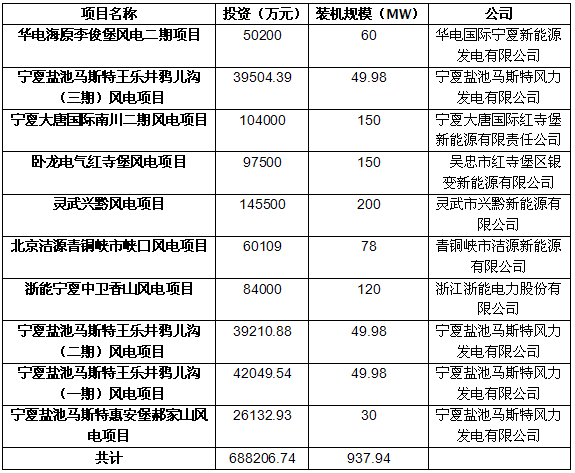 据悉,宁夏发改委近日连续核准批复包括华电海原李俊堡风电二期项目、大唐国际南川二期风电项目、卧龙电气红寺堡风电项等10个风电项目,总投资超68.8亿元,规模共计937.94MW。以下为核准项目详情: