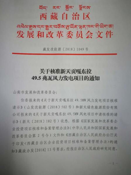 近日,西藏自治区发改委印发《关于核准新天贡嘎东拉49.5兆瓦风力发电项目的通知》(藏发改能源【2018】1049号),川渝藏筹建处西藏项目组经过两年努力,贡嘎东拉风电项目终获核准批复,这是继重庆狮子山风电项目核准后,川渝藏筹建处再为公司传捷报。至此,川渝藏筹建处2018年完成核准容量总计124.5兆瓦。
