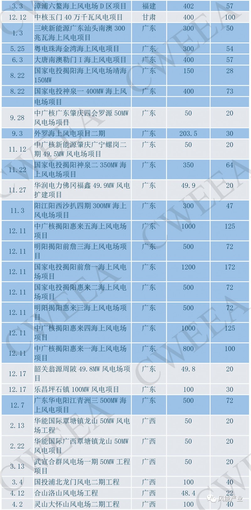 新增核准风电项目主要分布在安徽、福建、甘肃、广东、广西、河南、黑龙江、湖北、江苏、江西、山东、山西、陕西、上海、天津、浙江和重庆17个省(市)。其中有5个省份新增核准项目超过500MW,分别是安徽(10844MW)、广东(8703.2MW)、广西(1618.2MW)、湖北(1233.9MW)和浙江(700MW)。