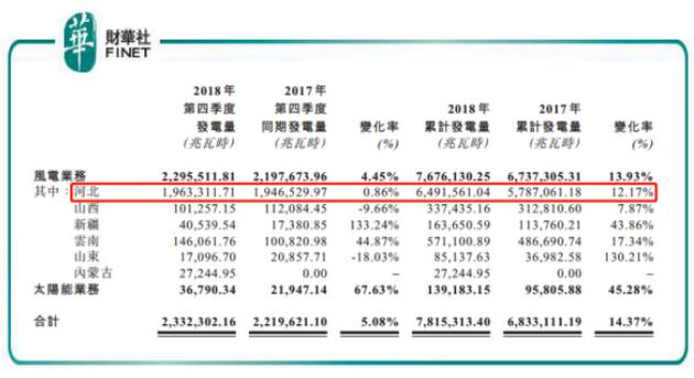 在这种情况下,新天绿色能源河北区域的发电量应该有较大幅度提升。但2018年全年增幅只为12.17%,与2017年40.86%的增幅相差甚远,这与弃风率和可利用小时数的良好表现完全不相干。