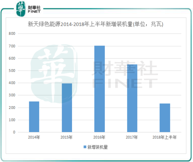 财华社发现,新天绿色能源2018年发电量增幅放缓跟其新增装机容量增速下降有关。在2016年新增装机容量达到顶峰后开始下降,2018年上半年新增装机容量234.5兆瓦,下降幅度较大,从而影响到其发电量。