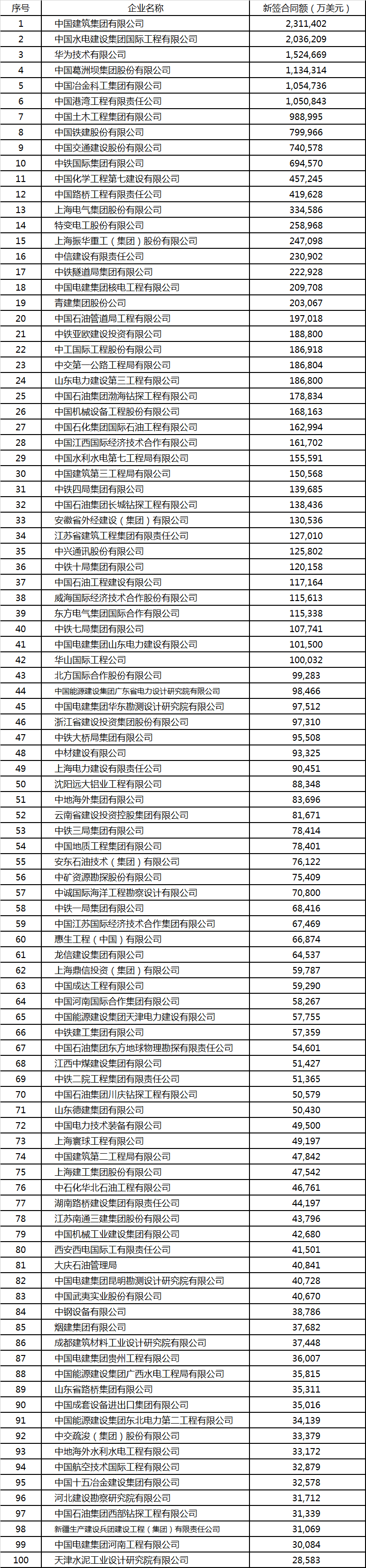 据悉,商务部最新发布了去年中国对外工程承包新签合同额100强企业,以下是名单。