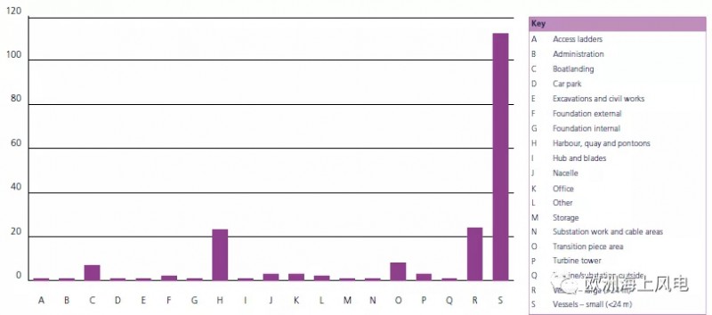 据英国2014年海上风电安全事故统计显示,海上事故占比最大,而其中小型船只(例如运维船)上发生的安全事故又遥遥领先与其它海上安全事故(如图中柱形S),值得业内高度重视。