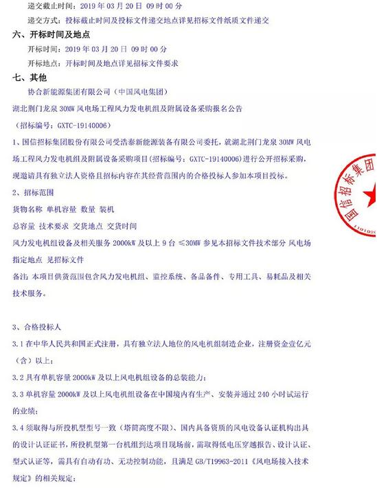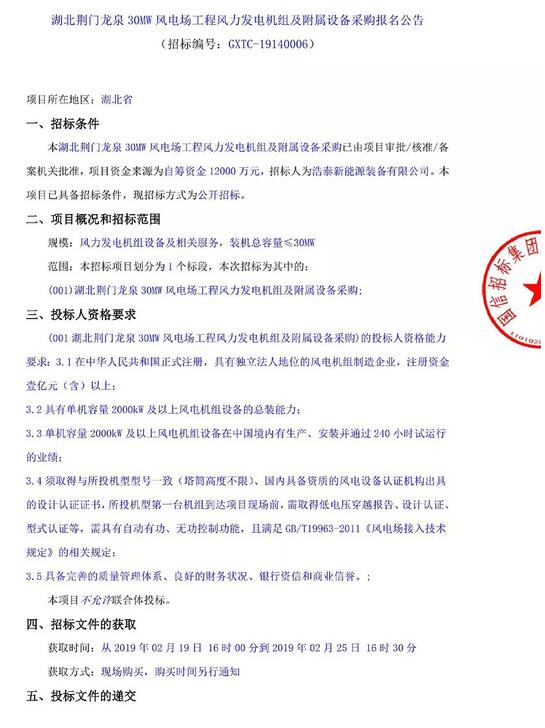 湖北荆门龙泉30MW风电场工程风电机组采购招标公告