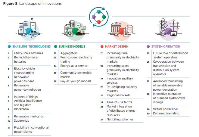 电气化、分散化和数字化正在引领创新趋势,为更多可变可再生能源提供了系统灵活性。 通过在支持技术,市场设计,商业模式和系统运营4大方面的30项不同创新,将电力部门转变为核心。