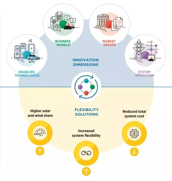 电气化、分散化和数字化正在引领创新趋势,为更多可变可再生能源提供了系统灵活性。 通过在支持技术,市场设计,商业模式和系统运营4大方面的30项不同创新,将电力部门转变为核心。