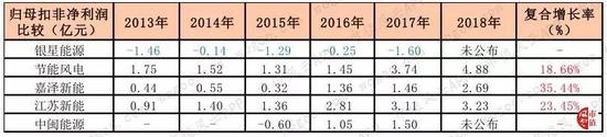 银星能源虽然营收规模较大,但归母扣非净利润自2013年起年年是负值,2013年至2017年累计亏损4.74亿;其中,2015年的亏损最多,达1.29亿,2014年的亏损最少,为1400万。
