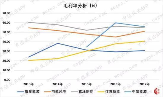 中闽能源在2014年置入风电资产后,毛利率提升较快,毛利率在2016年和2017年是同行业上市公司中最高。此外,江苏新能的毛利率从20.31%提升至40.59%,呈明显上涨趋势。